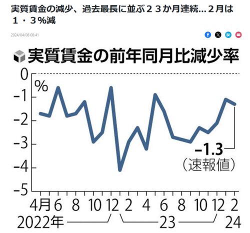 厚生労働省の発表した2月の毎月勤労統計調査によりますと、実質賃金が過去最長に並ぶ23か月連続の減少となりました。 この減少期間はリーマン・ショックなどで景気が低迷した2007年9月~09年7月と並び、最長を記録しています。 厚生労働省が8日…