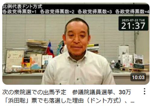 参議院で最も働いた男とも言われる浜田聡氏が今回の参院選で落選しました。 20日投開票の参院選の比例代表で、NHK党から出馬していた現職の浜田聡氏は個人では全体の7位となる33万票余りを獲得しましたが、NHK党の総得票数が約68万票にとどまり議席の配分が…